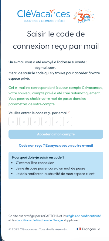 There is no traveller account at the moment on clevacances.com, a little patience we are currently working on this. In the meantime, go straight to your emails, where you have received a link allowing you to access your booking.