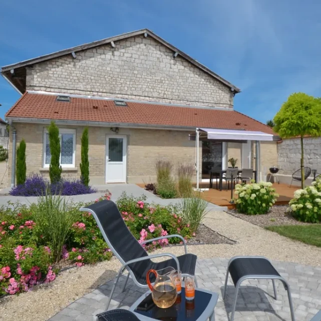 Grande terrasse aménagée avec salon de jardin donnant sur un jardin fleuri, équipée de chaises longues pour se détendre au soleil.