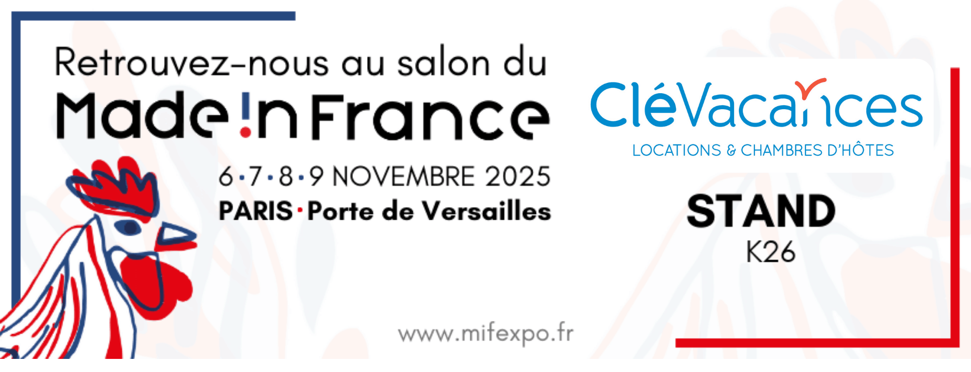 Du 6 au 9 novembre 2025, Clévacances sera présent au Salon du Made in France à Paris. Venez découvrir nos hébergements labellisés, participer à un grand jeu-concours et profitez de votre invitation gratuite !