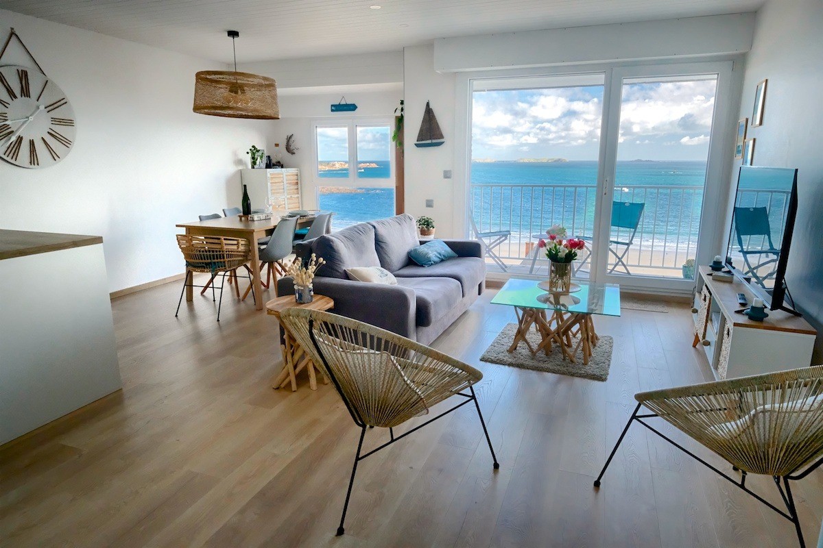 Bienvenue dans notre appartement (classé 4****meublé de tourisme) de standing situé dans un cadre idyllique à Perros-Guirec face à la magnifique plage de Trestraou et l'archipel des 7 îles. Idéalement situé sur la Côte de Granit Rose, il bénéficie d'une vue panoramique imprenable sur la mer, vous permettant de profiter de paysages à couper le souffle tout au long de votre séjour. Installé au 5ème et dernier étage d'une résidence très calme et sécurisée, l'appartement allie décoration contemporaine, confort et qualité. En couple, en famille, en solo, à tous les âges, pour une escale détente, bien-être, un séjour sportif, culturel, gastronomique..., venez poser vos valises dans notre appartement, au cœur de la Côte de Granit Rose et à proximité de tous les sites touristiques. Profitez pleinement de votre séjour où tout est accessible à pied : les commerces pour vos courses quotidiennes, les boutiques locales, les restaurants, le point de départ des nombreuses randonnées le long de la Côte de Granit Rose et du GR34, les activités de loisirs nautiques ( embarcadère pour les 7 îles en bateau et école de voile + surf), la pêche à pied et en mer, la thalassothérapie et SPA , les activités culturelles : cinéma, expos et festivals tout au long de l'année. Le confort garanti dès votre arrivée : - lits faits pour votre arrivée + linge de maison + serviettes de toilette + produits ménagers éco-responsables sont fournis. - inclus : chauffage + électricité + eau (en consommation éco-responsable et raisonnée) + wifi gratuit - garage privatif fermé à disposition pour votre voiture, vélos ou équipements de plage - local vélo L'appartement dispose : - d'un balcon avec une petite table et deux chaises. - d'une entrée avec placards à chaussures, d'une cuisine moderne entièrement équipée et d'un salon/séjour doté de deux grandes baies vitrées offrant une vue mer panoramique. Un canapé convertible de qualité (140X200) dans le salon, bibliothèque, guides touristiques et de randonnées, jeux de société. -d'une chambre spacieuse avec son lit de 160x200 et son grand dressing vitré. - d'une salle d'eau comprenant de nombreux rangements, une douche à l'italienne de 90 X140 et d'une machine à laver le linge. - WC séparés - un garage privé et fermé : - un local privé est à disposition des locataires pour le rangement des vélos ou pour stocker planche à voile, body, surf, poussettes... + mise à disposition gratuitement : de parasols, jeux de plage pour les enfants, nécessaire bébé. Rien ne manque pour passer des vacances idéales ! Venez profiter du grand air, de la plage, des vagues, des rochers insolites, des sentiers de randonnée, des activités nautiques et bien-être, de la gastronomie locale et laissez vous tenter " une escale aux 7 îles" !!! N'hésitez pas à nous contacter pour tous renseignements ou demande, nous sommes flexibles . Nous proposons également un autre logement de même standing,sur clévacances, à Trébeurden : Les pieds dans l'eau