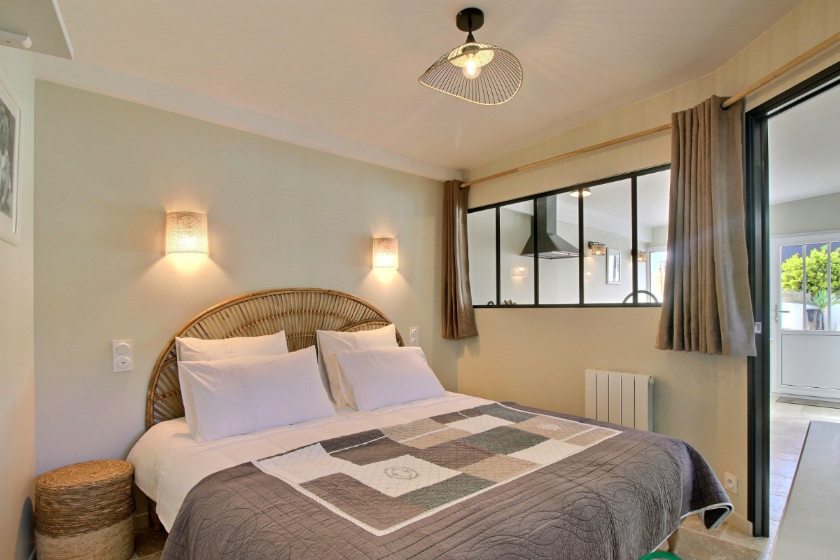 BIENVENUE AU GÎTE "GOVIHAN". A 400 m de la plage, le gite est blotti dans un quartier calme et agréable, tout en étant proche des commerces.... . De plain-pied, ce joli logement de 30 m2 vous offre une pièce de vie avec cuisine, séjour, et salon. Vous disposerez d'une chambre, (1 lit king size180x200) avec une salle d'eau attenante (douche à l'italienne) et d'un wc séparé. A l'extérieur, vous profiterez d'une 1ère terrasse en bois sans vis-à-vis de 12 m² et à l'avant de la maison, d'une cour close de 10 m² avec une seconde terrasse et un petit jardin clos aménagé d'un salon de jardin, 2 transats et un barbecue. Places de parking dans la rue devant le gite (gratuit). UN ANIMAL ACCEPTÉ SUR DEMANDE PRÉALABLE. De nombreuses activités sont accessibles à pied ou à vélo depuis l'hébergement: plage, sentiers de randonnée, pistes cyclables, shopping, casinos, restaurants, quai d'embarquement.... 3 marchés par semaine sur place. Le prix inclus la mise à disposition des draps (lit fait), torchons, serviettes de toilettes et le chauffage.Wifi gratuite. Non aménagé pour les personnes handicapées. L'option "ménage fin de séjour"(40€) n'est pas incluse dans le prix.