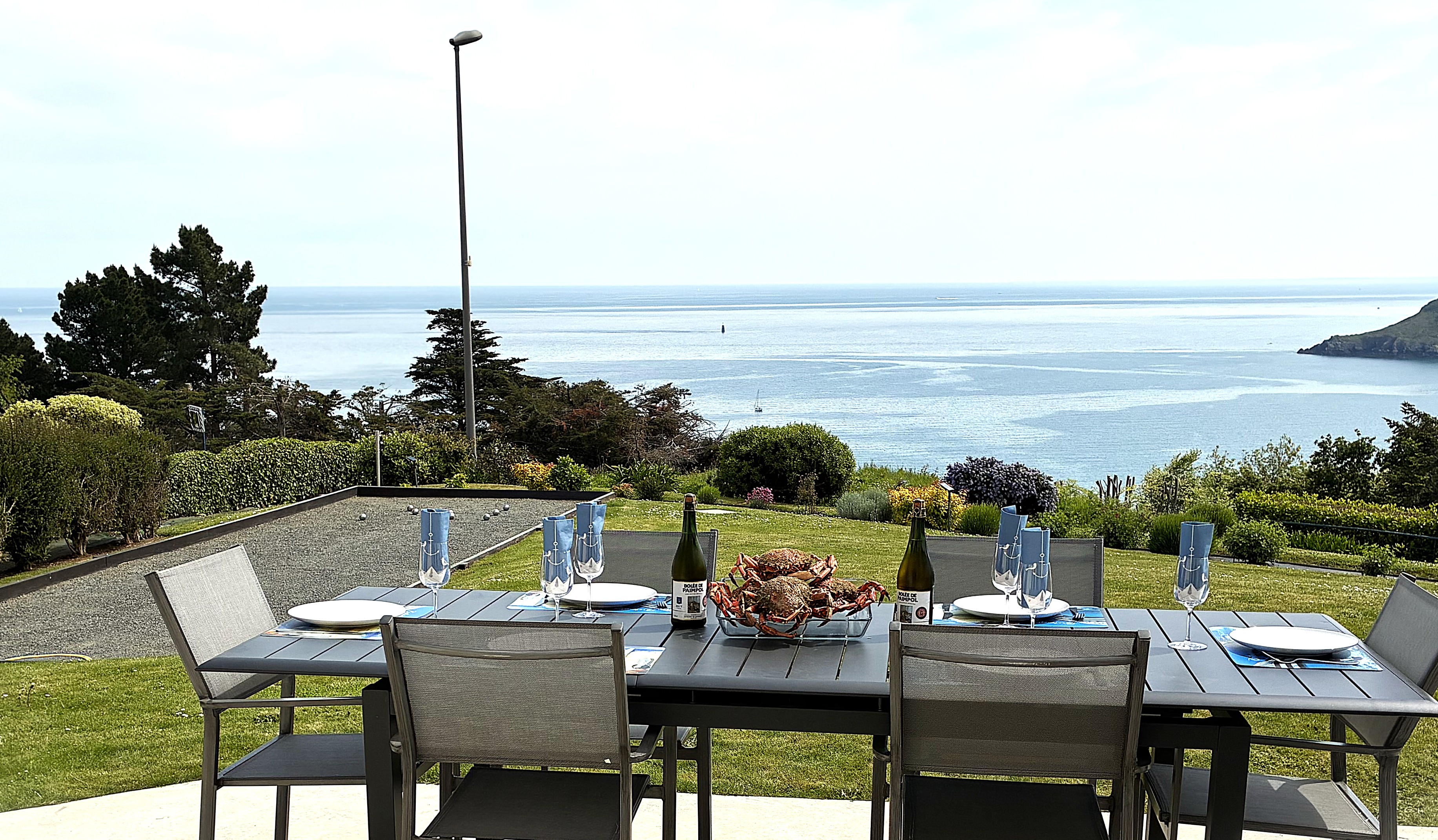 Superbe villa, bord de mer, 2 à 9 personnes, avec vue étonnante sur la baie de Bréhec, aménagée pour des séjours tout confort en famille ou entre amis. La maison se compose au rez-de-chaussée : * _d'une entrée _ * _d'une grande pièce à vivre avec salon, salle à manger et cuisine. _ * _d'un couloir desservant 3 chambres indépendantes et une salle d'eau, ainsi qu'un WC indépendant et une buanderie avec lave-linge et sèche-linge privés_ * _Vous disposez de deux chambres indépendantes avec lit de 180*200_ * _et une petite chambre avec lit superposé (prise pour un couchage dans le label ce qui explique la capacité de 9 et non 10 personnes) de deux lits simples de 90*190_ A l'étage vous apprécierez : * _ce salon avec superbe vue mer, son espace canapé, bureau pour télétravailler ou écrire ces cartes postales de vacances, son espace bar_ * _la deuxième salle d'eau avec douche et WC_ * _la chambre indépendante (sous toit en partie) avec un lit de 160_ * _l'espace couchage en mezzanine du salon avec 2 lits simples de 90*190_ Pour votre confort la maison est entièrement équipée : * avec garage, borne de recharge électrique - forfait 45€ / voiture électrique / semaine * douche retour de plage accessible aussi en RDV En extérieur, ambiance assurée grâce au boulodrome face à la mer avec le barbecue, la grande terrasse et son mobilier de jardin. Pour vos loisirs vous disposez également d'un table de ping-pong, d'un baby foot, de deux télévisions, Internet via fibre optique. Villa louable par semaine et aussi pour des séjours de plus courtes durées. _Commentaires laissés par les locataires à voir sur le site - mediavacances.com - référence annonce : A105504_ N'hésitez pas à nous contacter pour plus d'informations et afin de vous aider à préparer au mieux votre prochain séjour en Bretagne !!! _Options : __linge de maison et ménage obligatoire : 150 euros // __borne électrique / véhicule : 45 euros par semaine._ _ _