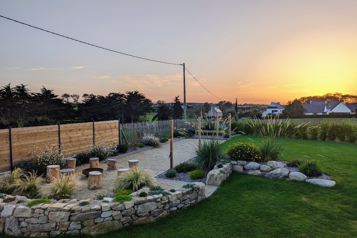 "Le Hangar" situé à 300 m des plages à proximité du petit port de Moguériec est une location née d'une petite ferme typiquement bretonne avec une maisonnette en pierre accolée à un hangar agricole intégralement rénovés et aménagés pour les transformer en lieu unique et tout confort. Le filet suspendu fera le plaisir des enfants, et les prestations offertes par cette spacieuse et lumineuse maison ne manqueront pas de charmer les adultes. Le jardin paysager propose de quoi contenter toute la famille : spa extérieur, terrain de pétanque, braséro, table de ping-pong .. Maison indépendante pour 8 personnes RDC : Cuisine équipée (combiné-congélation, four, micro-onde, lave-vaisselle...) séjour-salon, 1 chambre avec 1 lit 160, 2 salles d'eau, 2 WC indépendants, Etage : 1 chambre avec 1 lit 160, 2 chambres avec 2 lits 90, un espace détente avec filet supendu Equipements et services : TV, Internet WIFI, poêle à granules, buanderie avec lave-linge et sèche-linge, linge de lit et de toilette fournis, lits faits à l'arrivée, lit bébé et matériel Extérieur : jardin et parking (carport) privatifs clos, garage à vélos, 2 terrasses, spa (Avril à Octobre, option à 200 euros du 02/11/2024 au 04/04/2025) pour 4 personnes (installation vers 15 Juillet), terrain de pétanque, prêt de vélos, espace convivial avec brasero, douche extérieure, salon de jardin, plancha, transats, jeux de plage pour enfants Tarifs : Consultez les tarifs en saisissant vos dates de séjour sur le planning Suppléments : Forfait ménage: 140 € Taxe de séjour (obligatoire) : 1.20 €/jour/adulte