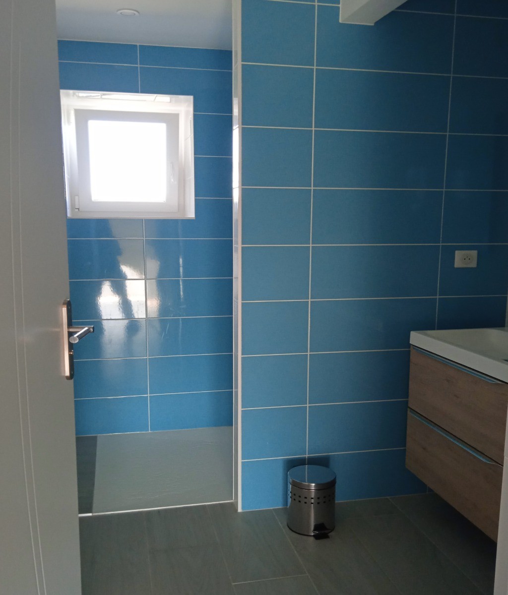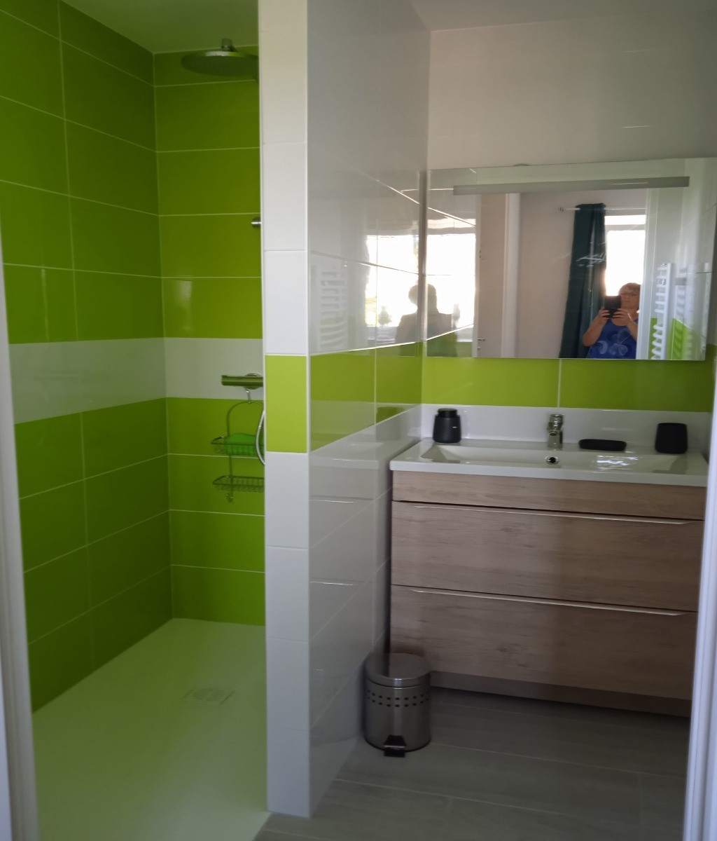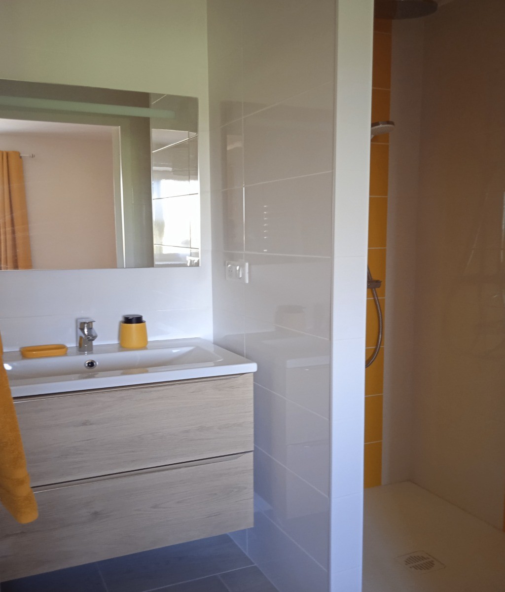 Chambre pour 4 personnes (un lit double et 2 lits superposés ou 2 lits simples et 2 lits superposés) avec salle de douche et WC indépendants et séparés.