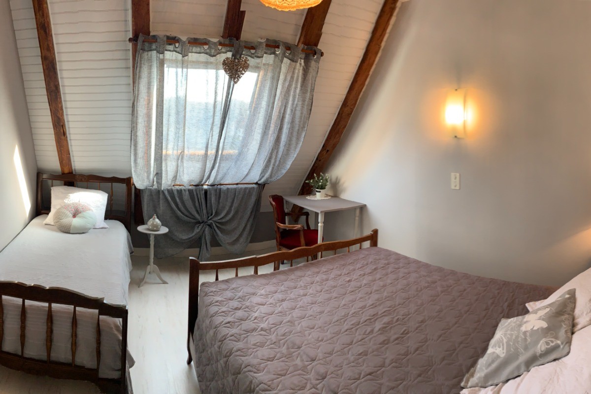 Chambre avec un lit double et 2 lits superposés en 80, douche, lavabo et WC