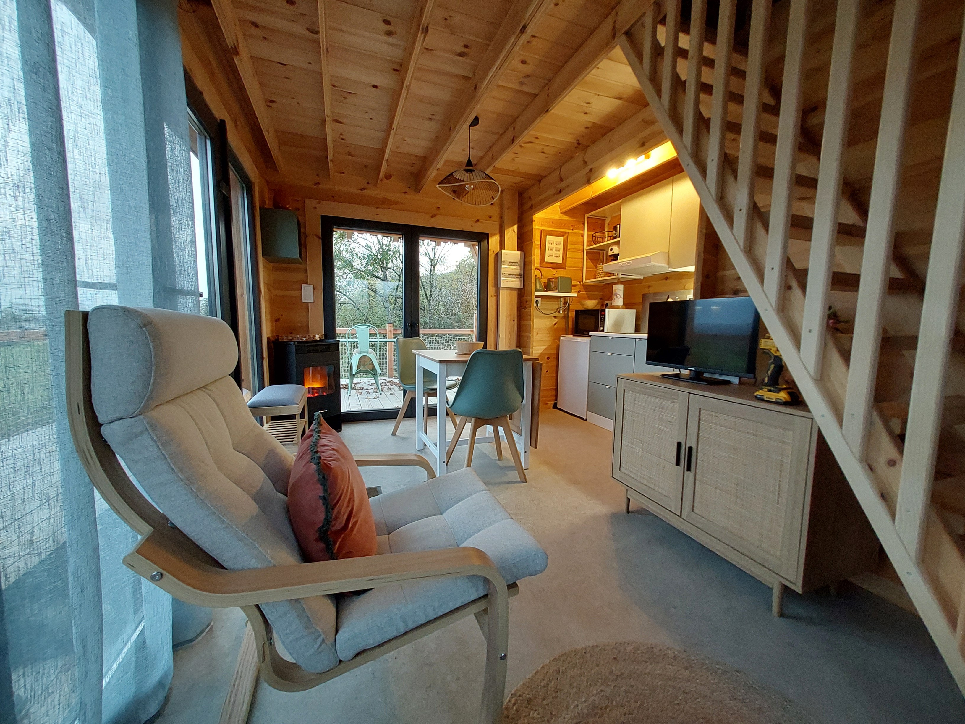 Une kitchenette avec une table de cuisine modulable, 2 chaises; un espace salon avec 2 fauteuils, un pouf, une petite table avec lampe, un meuble bas (livres, jeux) avec une télévision. WIFI