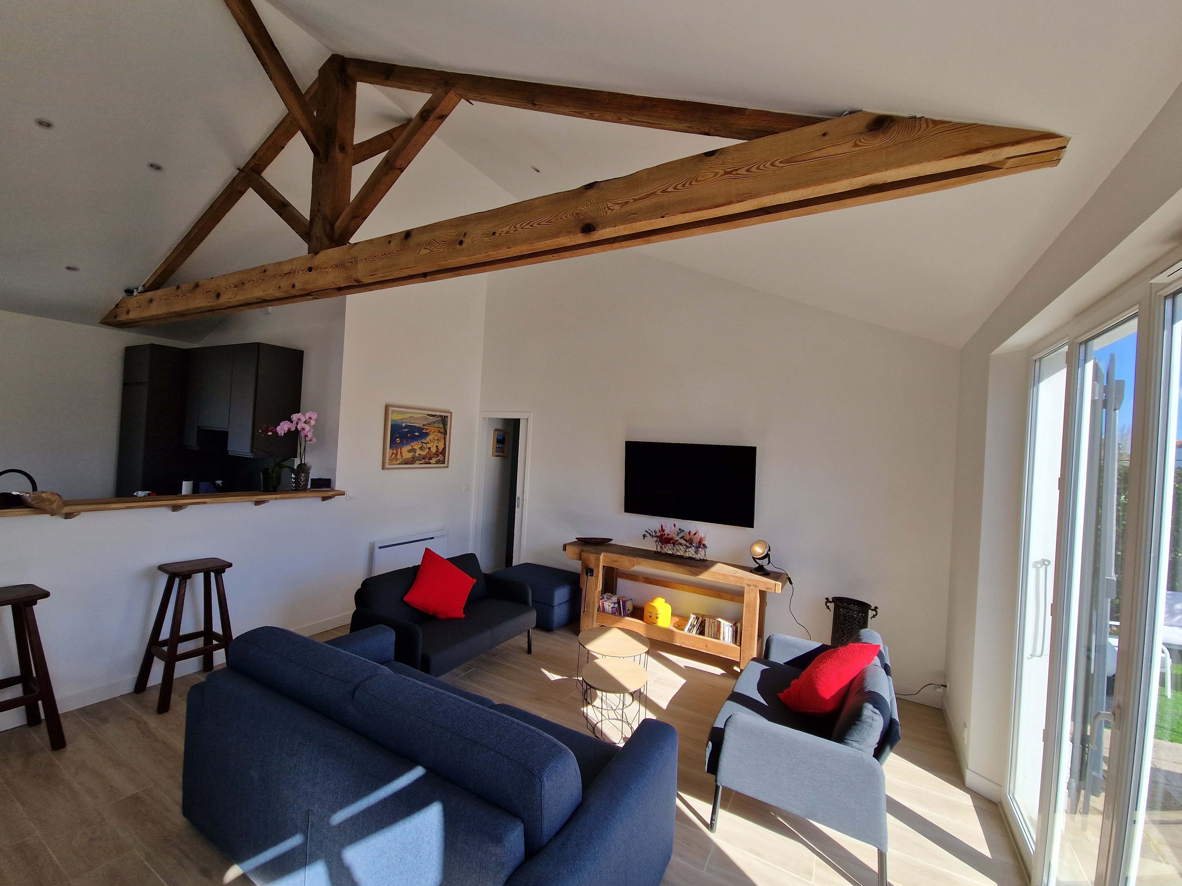 Espace salon avec 3 canapés et table basse. Table à manger pour 6 personnes. Placard pour le rangement des manteaux. Tablette et prise RJ pour télétravail.