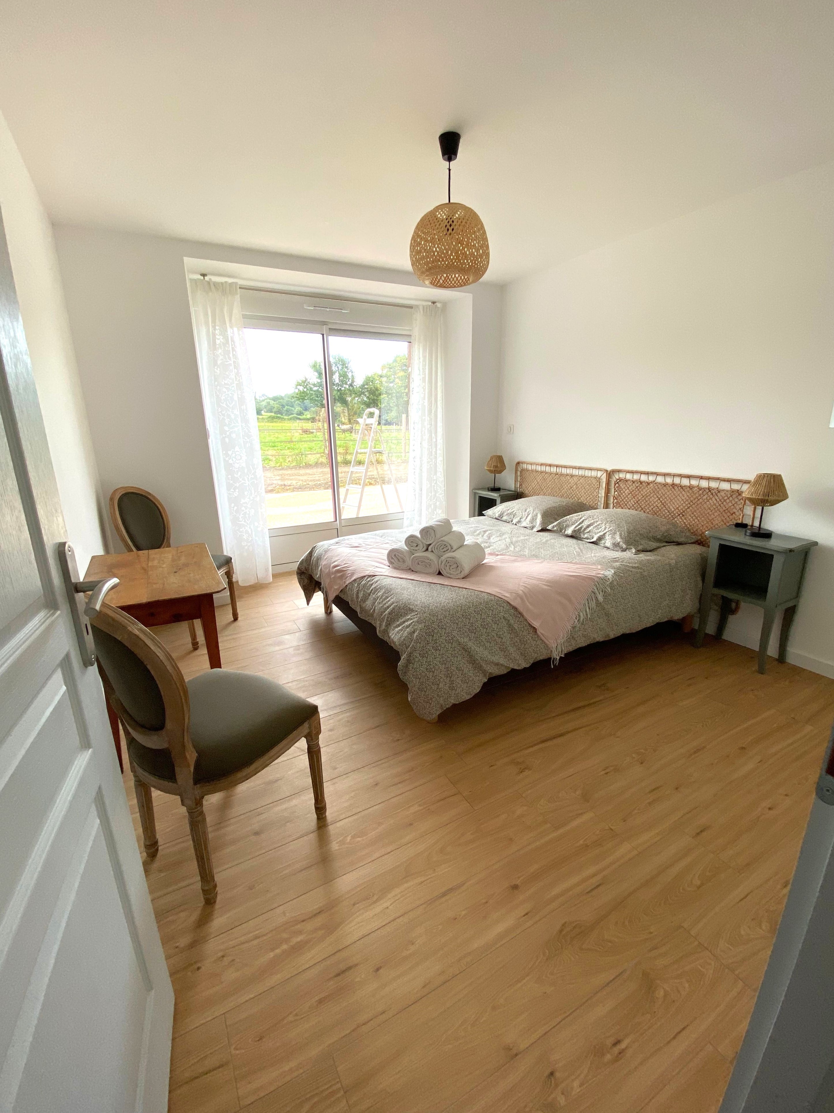 Chambre de plain-pied pour 1 à 2 personnes (lit queen size 160x200 cm) avec rangements et salle d'eau douche grande dimension communicante.