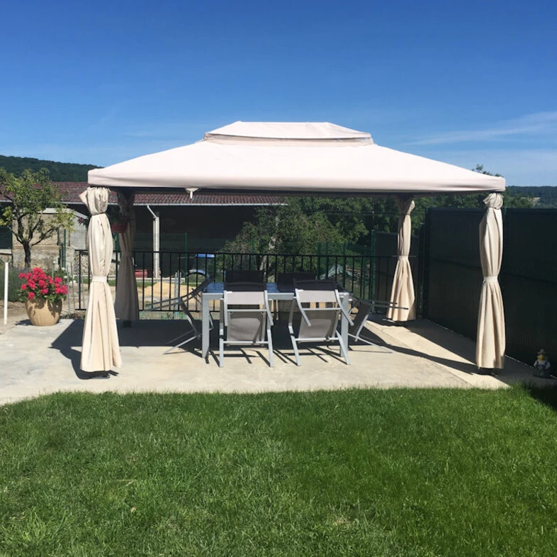 Terrasse avec tonnelle offrant une vue imprenable sur les vignes, équipée de chaises longues pour profiter pleinement des moments de détente en plein air.